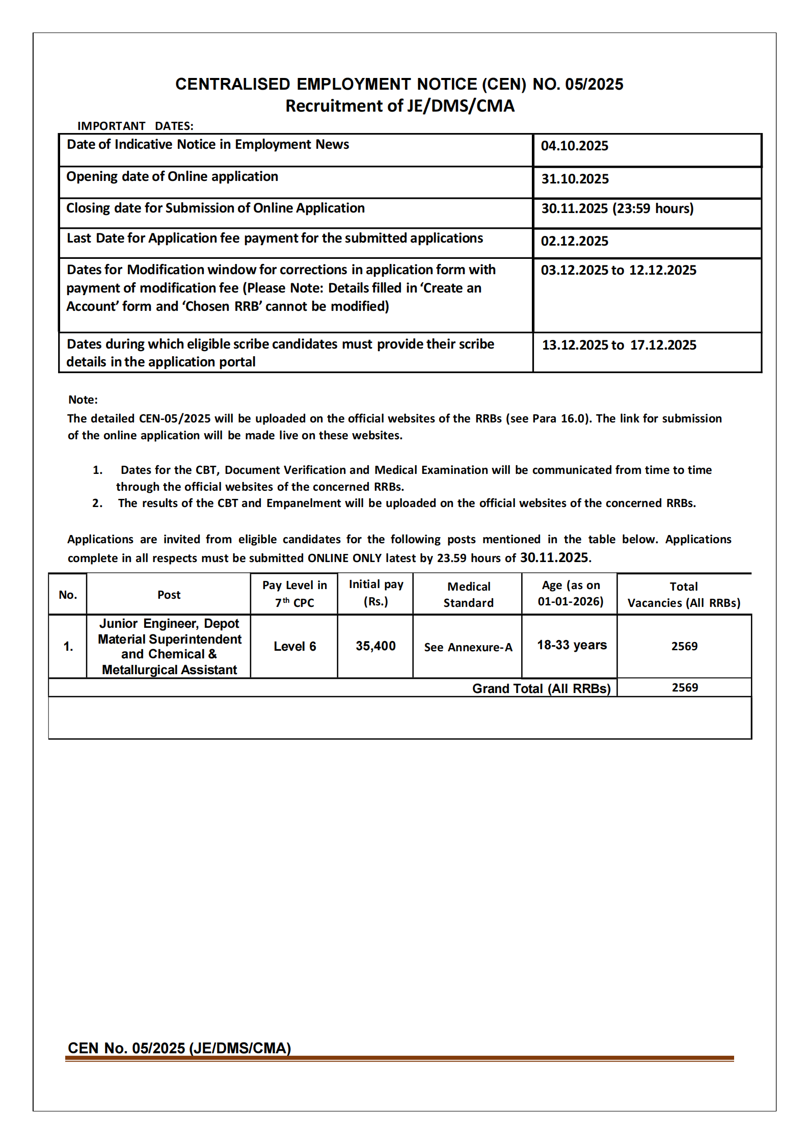 Railway Recruitment Board (RRB) has released 2569 Junior Engineer vacancies. Eligible candidates with B.Tech/B.E, Diploma can apply online from 31-10-2025 to 30-11-2025 at rrbguwahati.gov.in.
